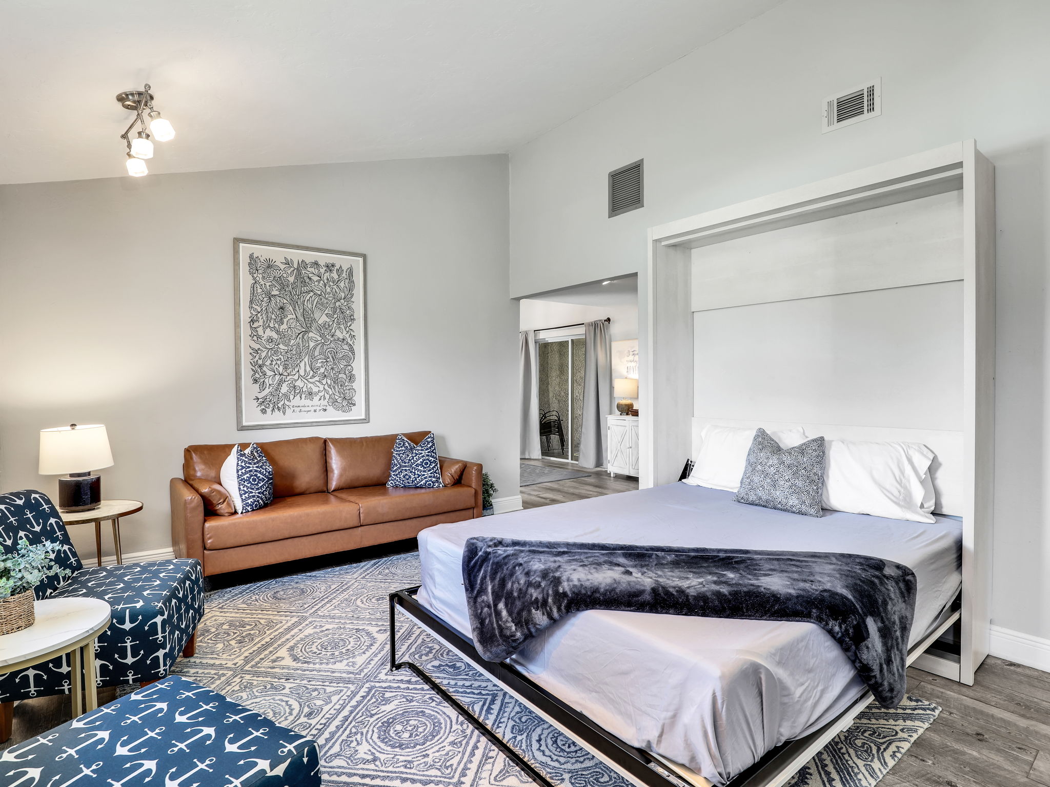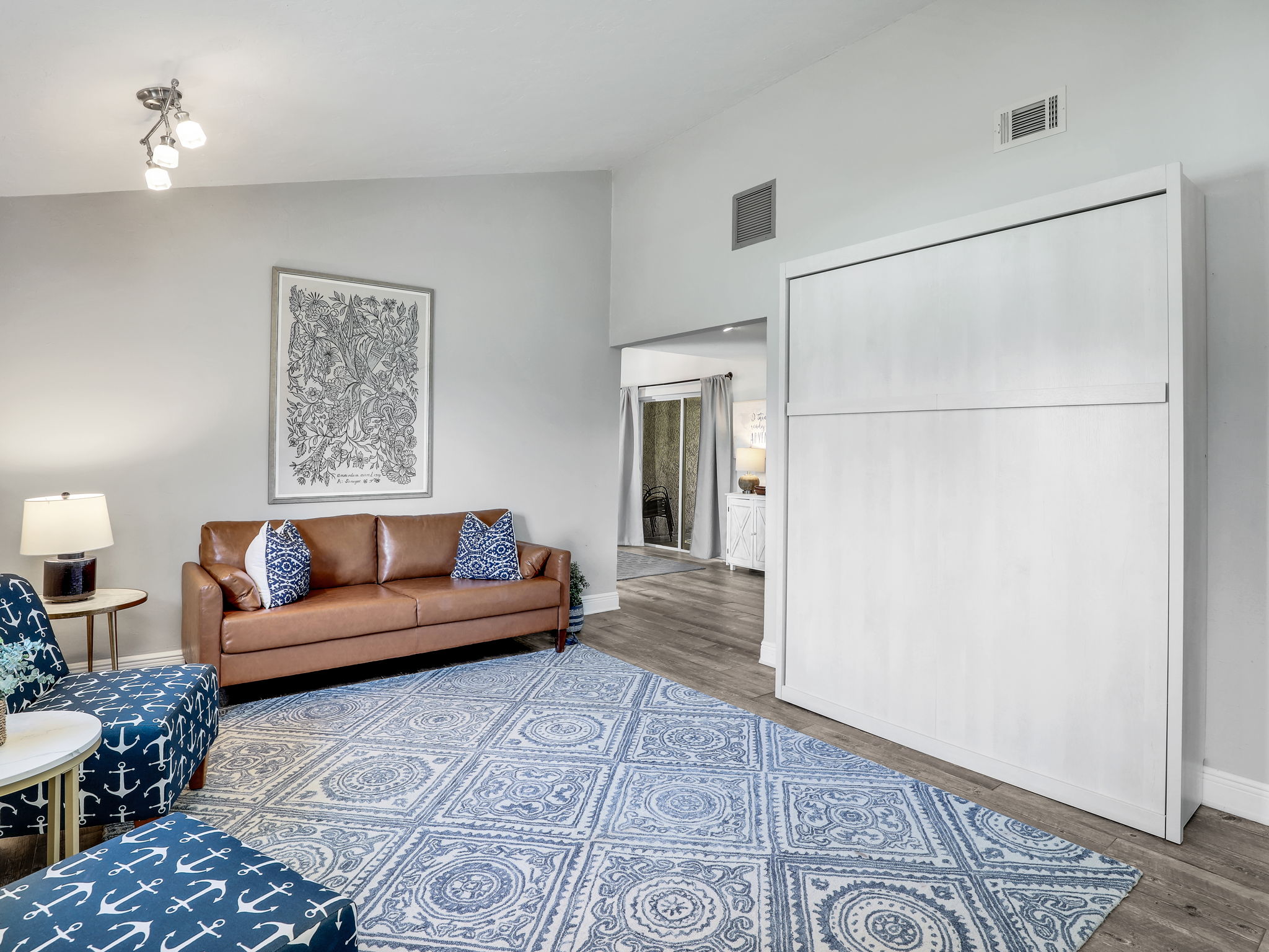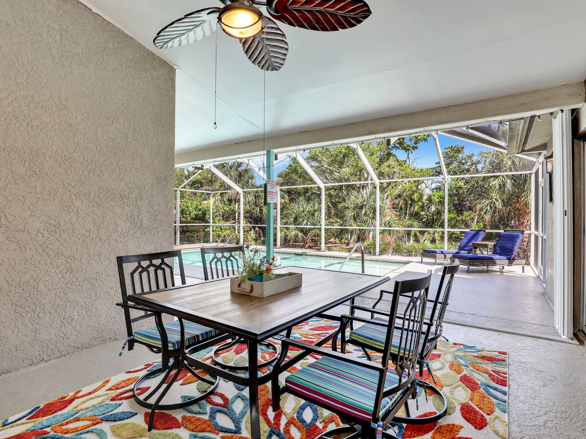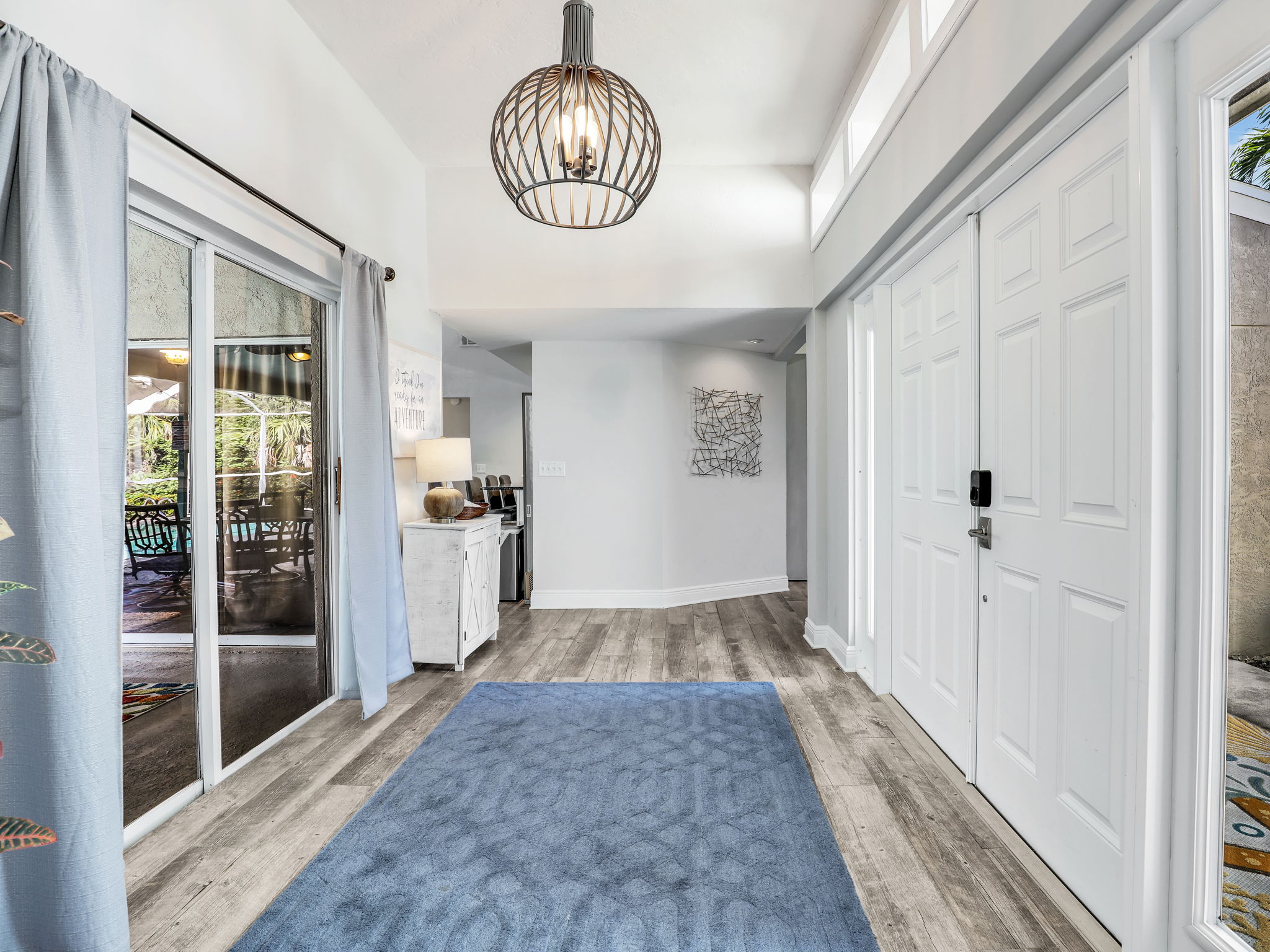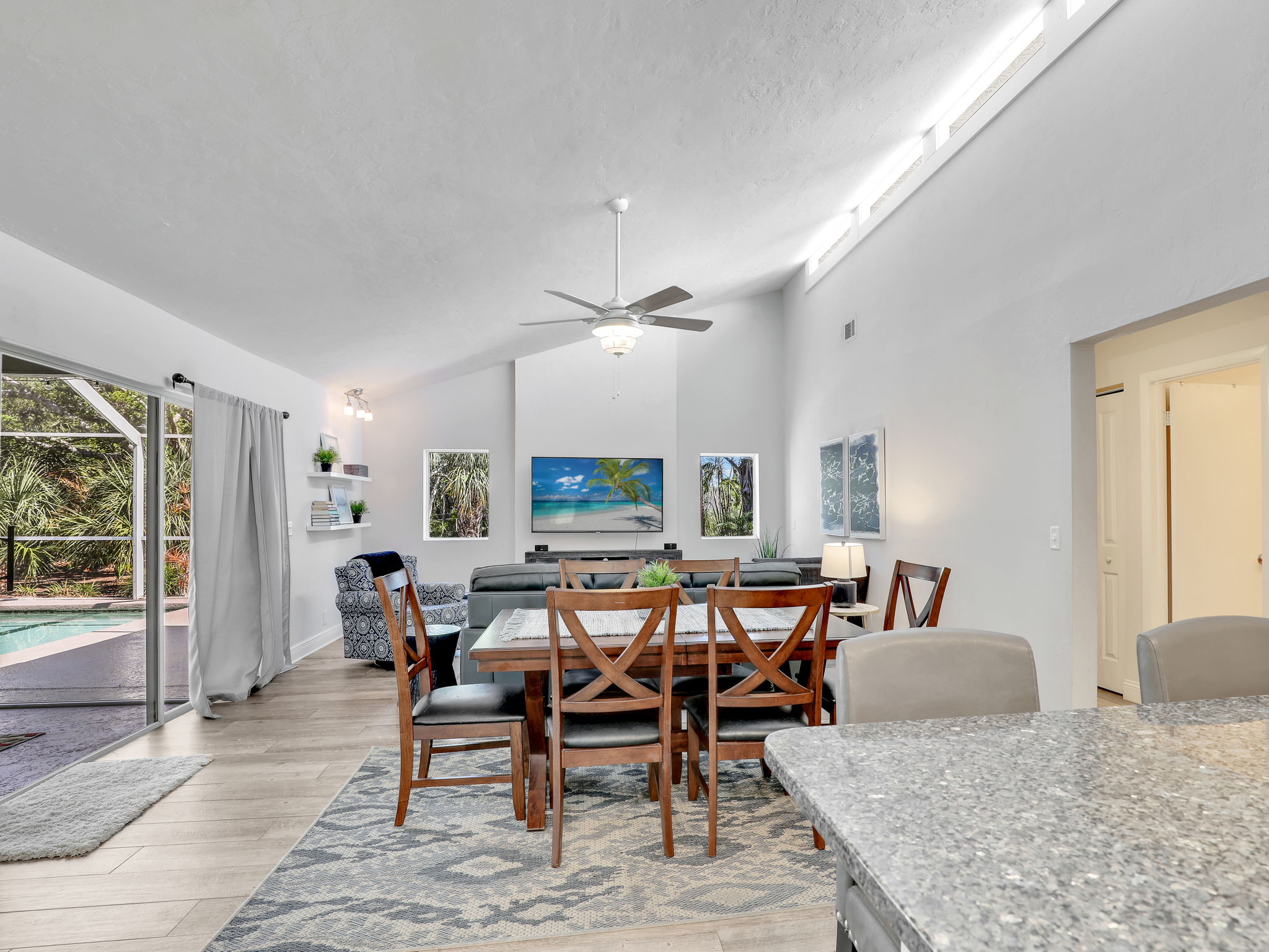 Bedrooms: Master Bedroom: King bed, Smart TV Second Bedroom: Queen bed, Smart TV Third Bedroom: Bunk bed with two full beds and a trundle, Smart TV Living Spaces: Living Room One: Sofa, 2 chairs, Smart TV with Apple TV Living Room Two: Sofa, Murphy bed Office: Equipped with a desk, perfect for working remotely Bathrooms: Bathroom 1: Modern shower Bathroom 2: Tub shower combination Outdoor Area: Patio: Lanai enclosure, heated concrete pool, and grill – ideal for outdoor dining and relaxation Backyard: Scenic views of a tranquil lake
